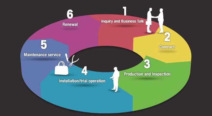 From the introduction of machinery to its operation, our sales engineering staff will gain a confident understanding of conditions. We will optimize life-cycle costs by suggesting ''maintenance plan'', "parts life-prolonging program," "renewal timing-assessment."